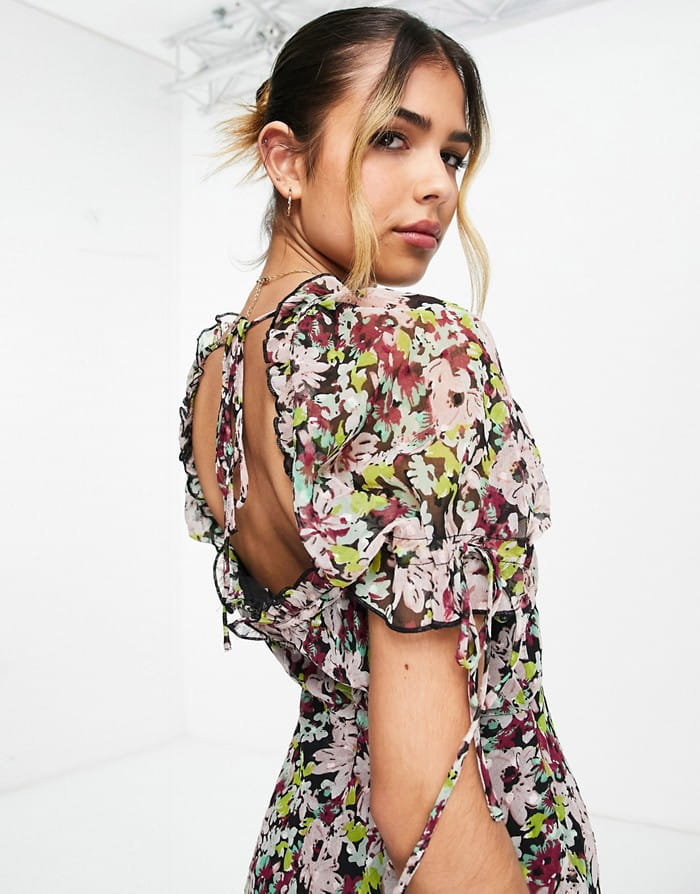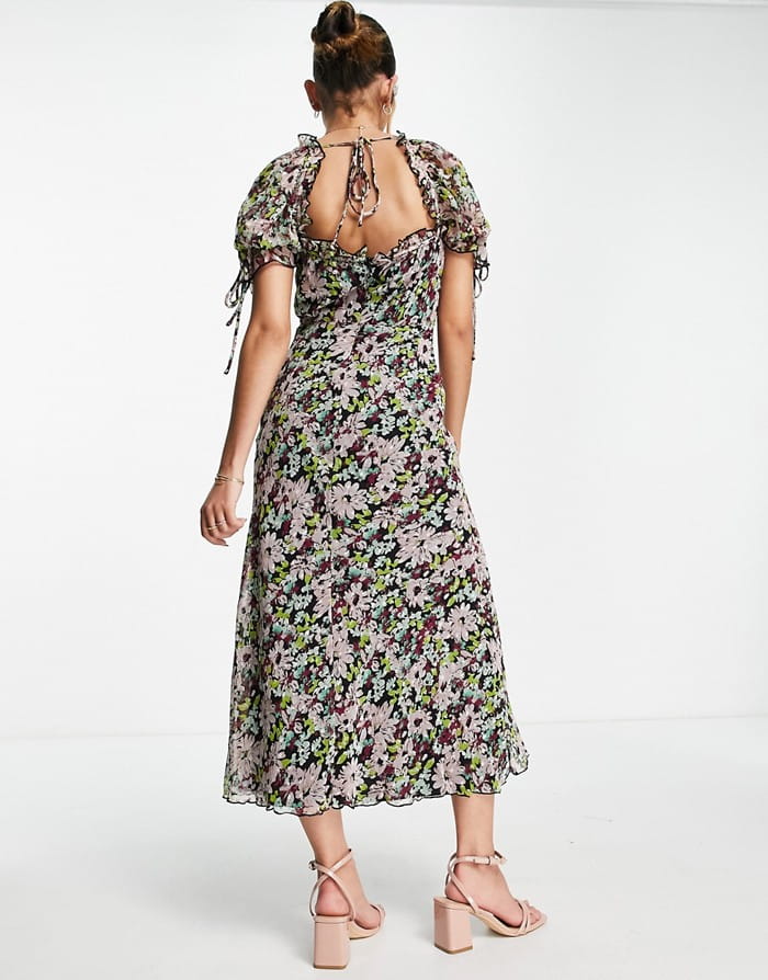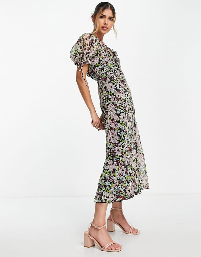 Ta elegancka czarna sukienka w kwiatowy wzór jest nie tylko stylowa, ale też wygodna. Posiada dekolt w kształcie serek lub V, a krótki rękaw dodaje lekkości i oryginalności. Idealna na wiele okazji.