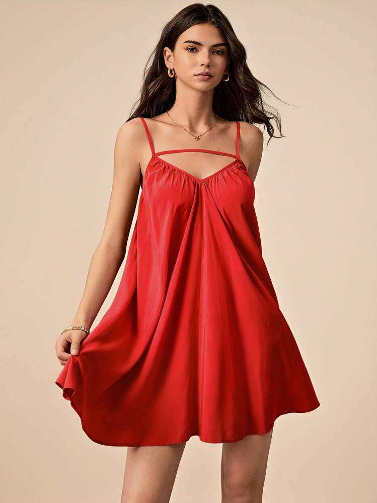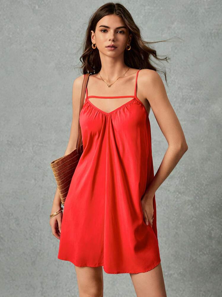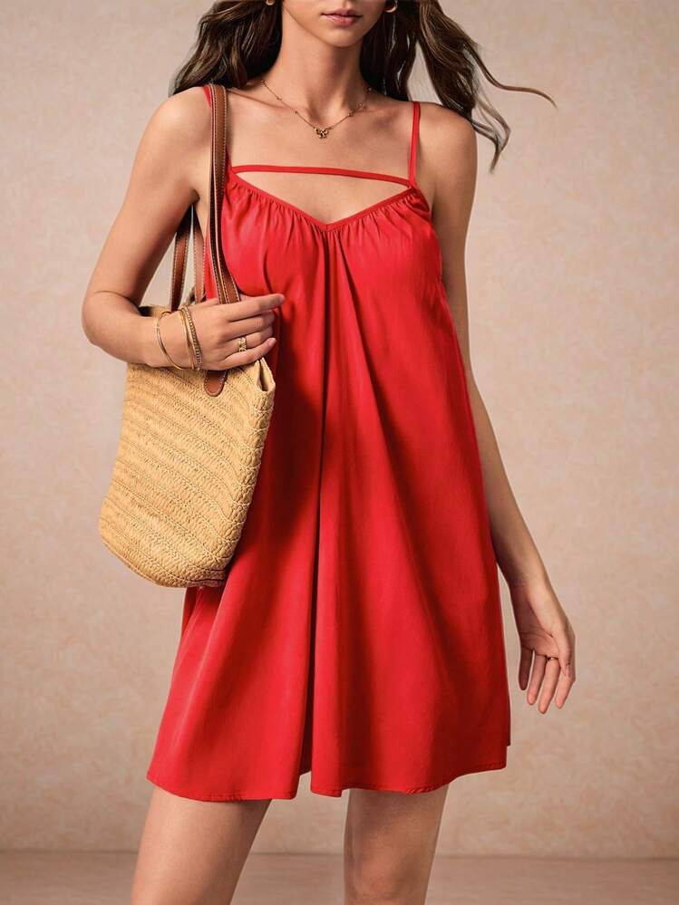 Ta czerwona luźna sukienka mini jest idealna na letnie dni! Wykonana z lekkiego i przewiewnego materiału, posiada prostokątny dekolt i ramiączka, które eksponują ramiona. Pięknie podkreśli Twoją kobiecą figurę.