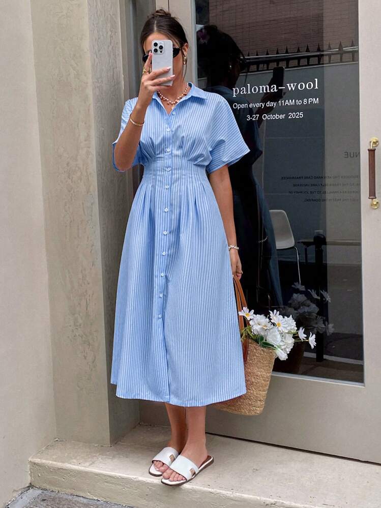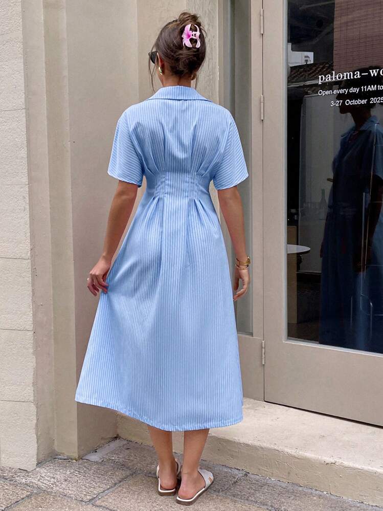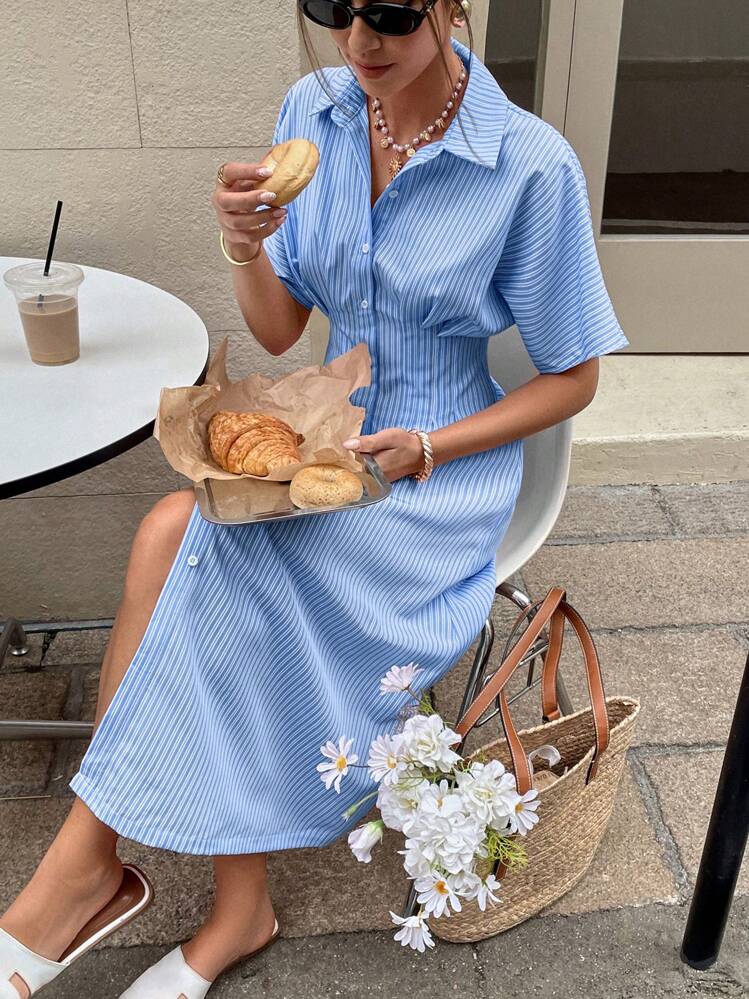 Ta piękna koszulowa sukienka w kolorze niebieskim z białymi paskami to idealny wybór na letnie dni. Posiada elegancki kołnierzyk i krótkie rękawy, dzięki czemu jest wygodna i stylowa. Pasuje do różnych stylizacji i okazji.