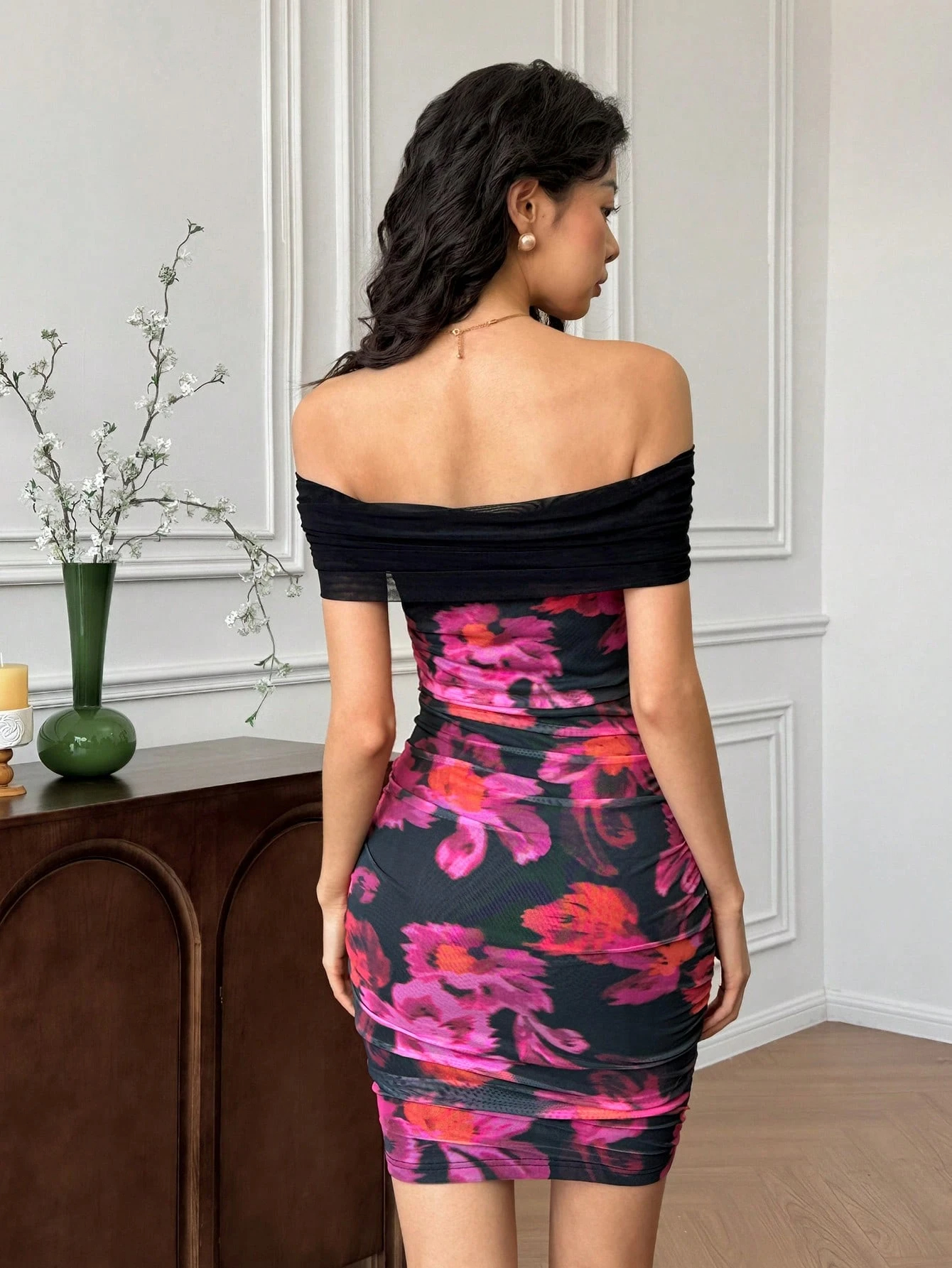 Elegancka i wygodna sukienka w kolorze czarnym z odkrytymi ramionami i krótkim rękawem. Dopasowany fason oraz subtelny wzór dodają jej uroku i klasy. Idealna na wieczorne wyjścia i specjalne okazje.
