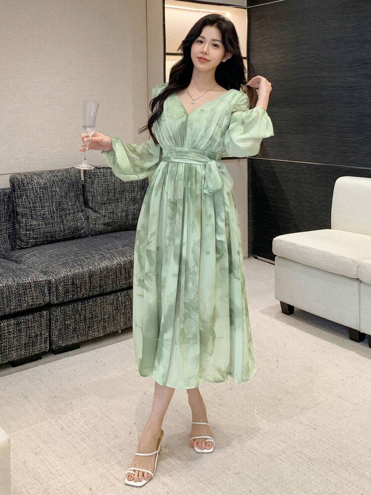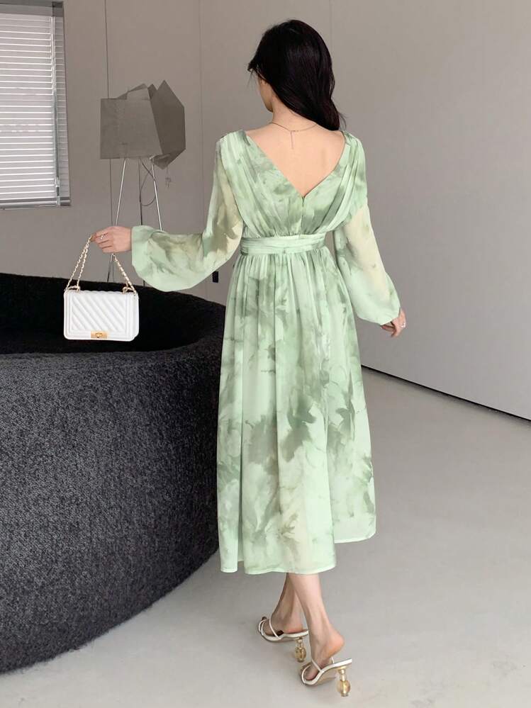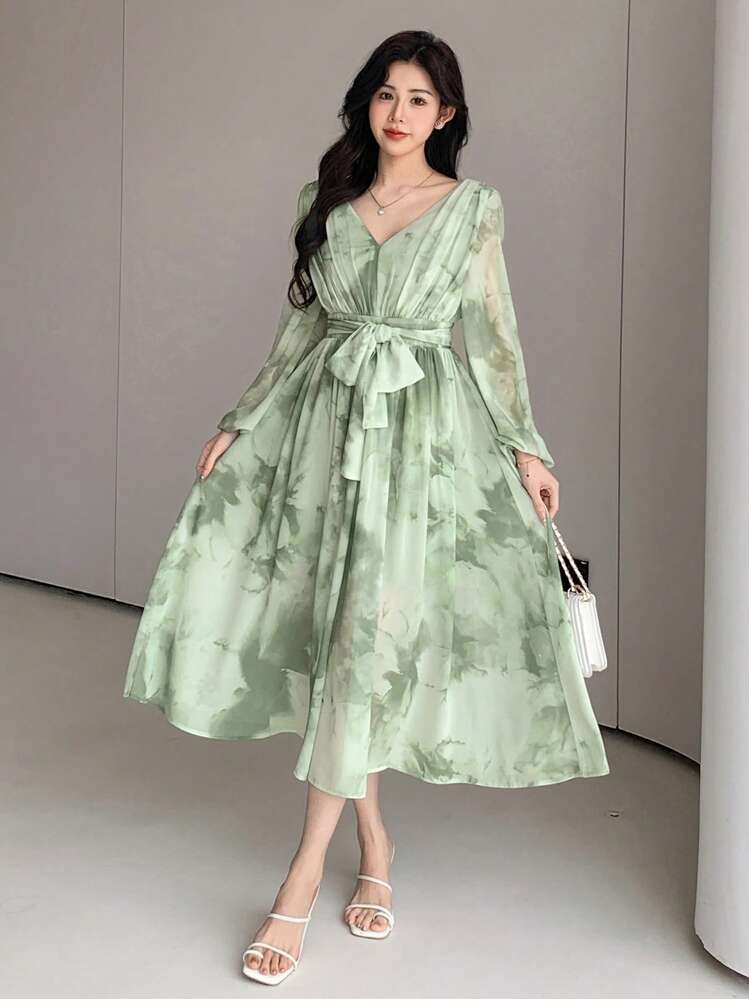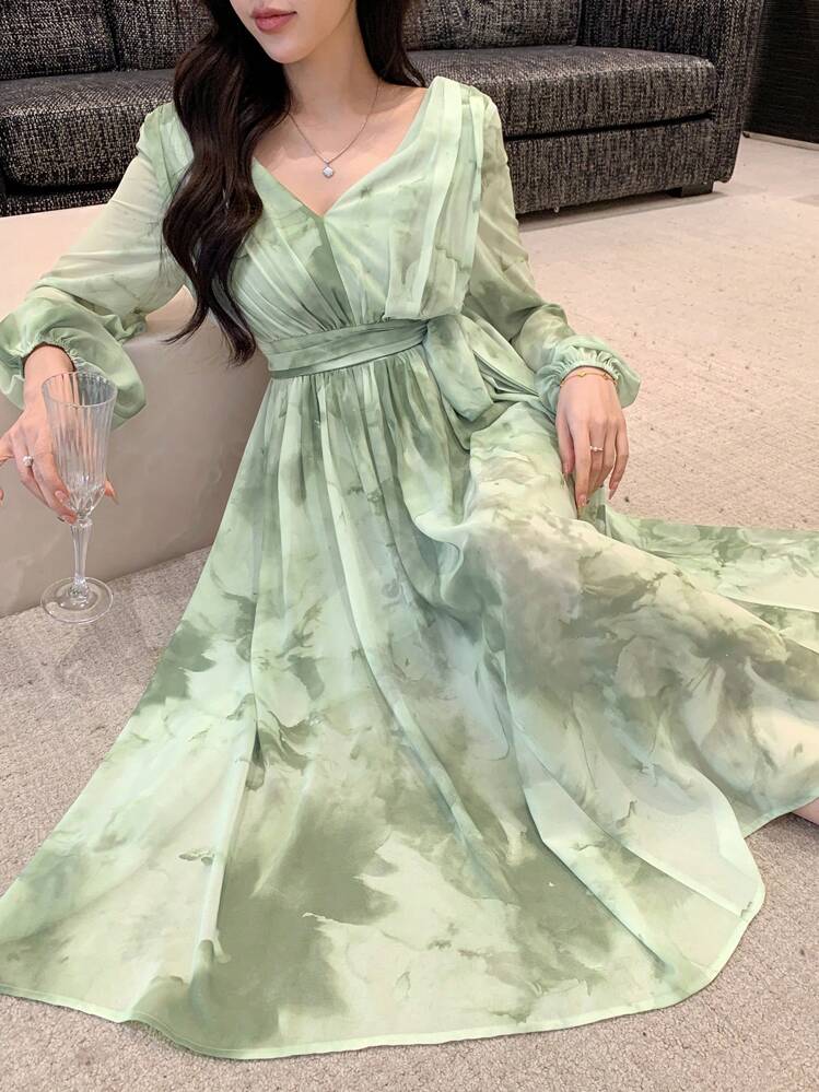 Modna sukienka z kolorowym wzorem w odcieniach zieleni. Oryginalny dekolt w serek dodaje szykownego akcentu. Długie rękawy dodają elegancji i sprawiają, że sukienka nadaje się na wiele okazji.