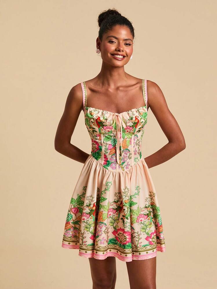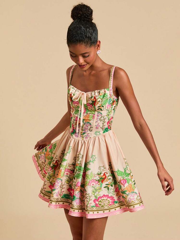 Lekka i zwiewna sukienka w odcieniu jasnoróżowym. Zdobiona delikatnym wzorem, idealna na lato. Dekolt wiązany dodaje uroku, a ramiączka eksponują ramiona. Mini długość dodaje dziewczęcego uroku.