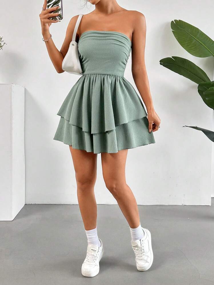 Stylowa i zwiewna sukienka mini w kolorze zielonym z odkrytymi ramionami, co nadaje jej niezwykle kobiecego i zmysłowego charakteru. Idealna na letnie spacery lub wieczorne wyjścia. Bez rękawów, co zapewnia maksymalny komfort noszenia.