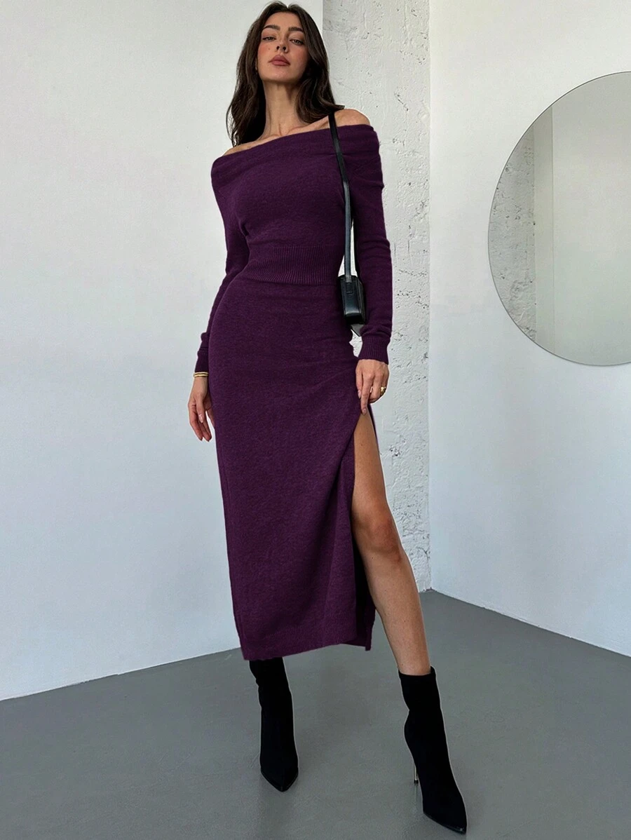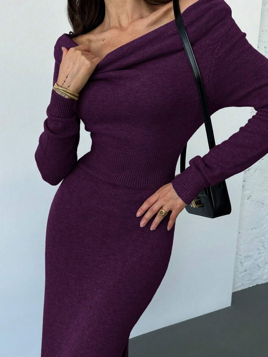 Fioletowa dzianinowa sukienka o długich rękawach to idealny wybór na chłodniejsze dni. Dekolt odkryte ramiona dodaje jej wyjątkowego charakteru, a długi rękaw zapewnia ciepło i komfort noszenia.