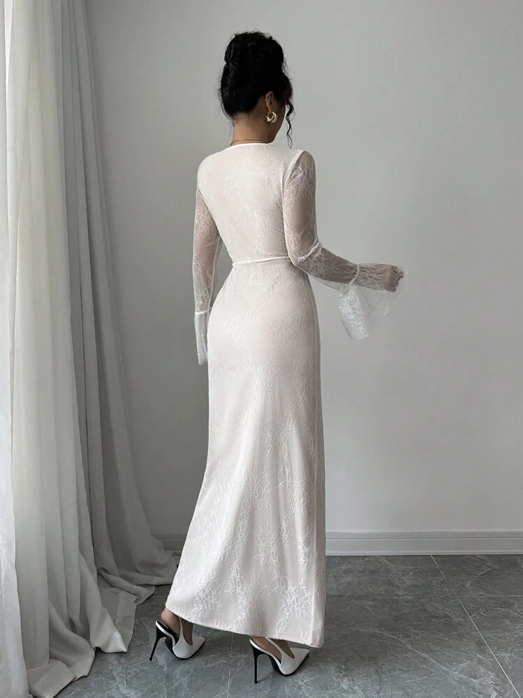 Elegancka biała sukienka wykonana z delikatnej koronki. Posiada kwadratowy dekolt i długie rękawy, co nadaje jej subtelności. Idealna na wieczorne wyjścia i romantyczne spotkania.