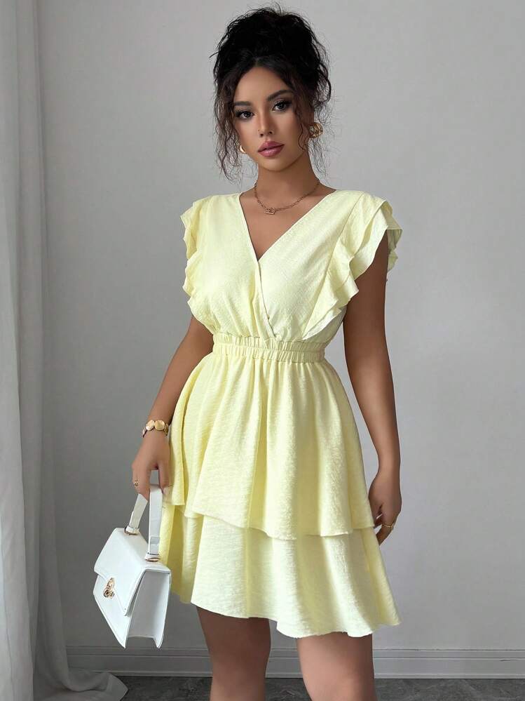 Żółta sukienka z falbanami to idealna propozycja dla kobiet lubiących kolorowe i kobiece stylizacje. Kopertowy dekolt i krótki rękaw dodają jej szyku i elegancji. Doskonale sprawdzi się na wiele okazji.