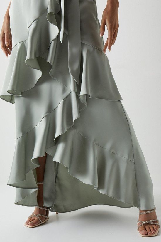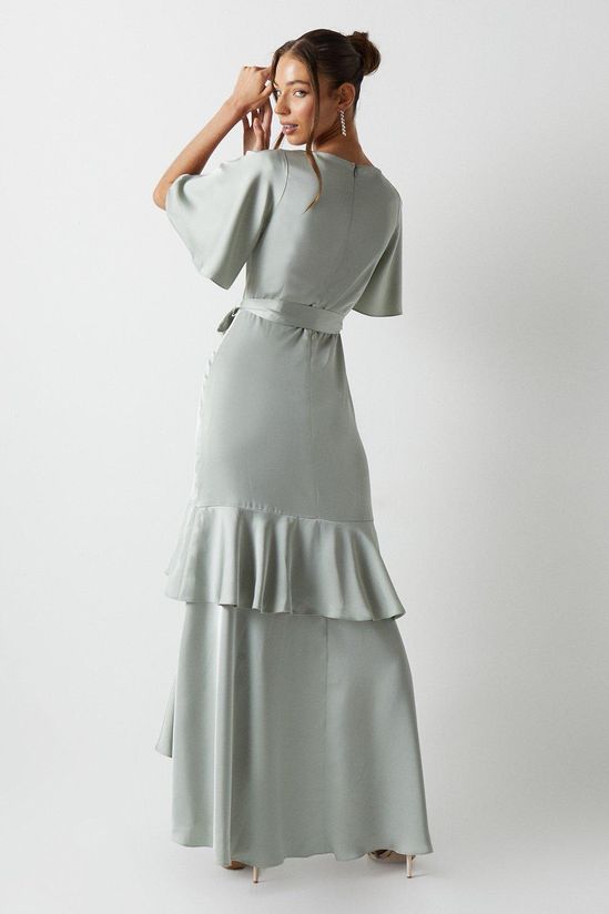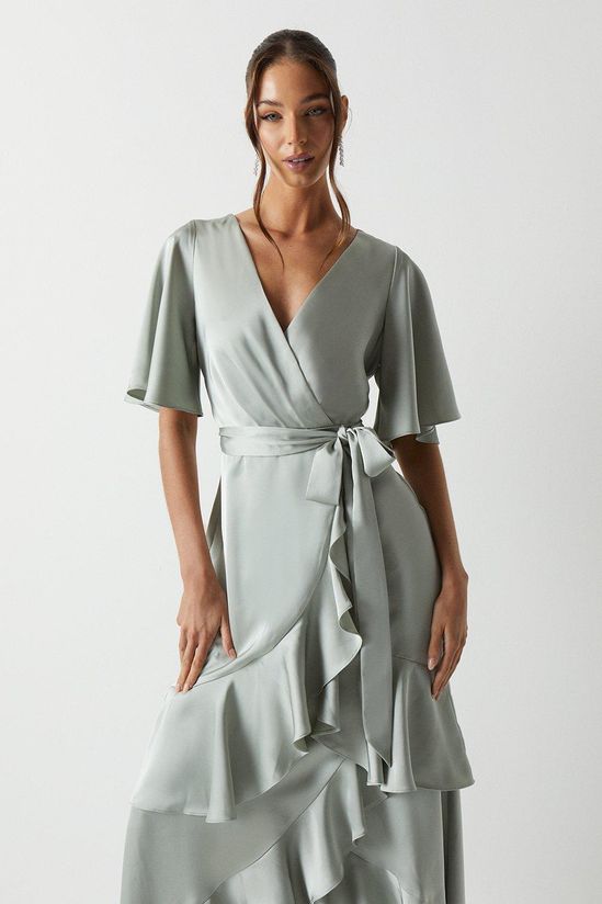 Elegancka sukienka z satyny w kolorze zielonym. Posiada kopertowy dekolt oraz krótkie rękawy. Idealna na specjalne okazje i wieczorne wyjścia.