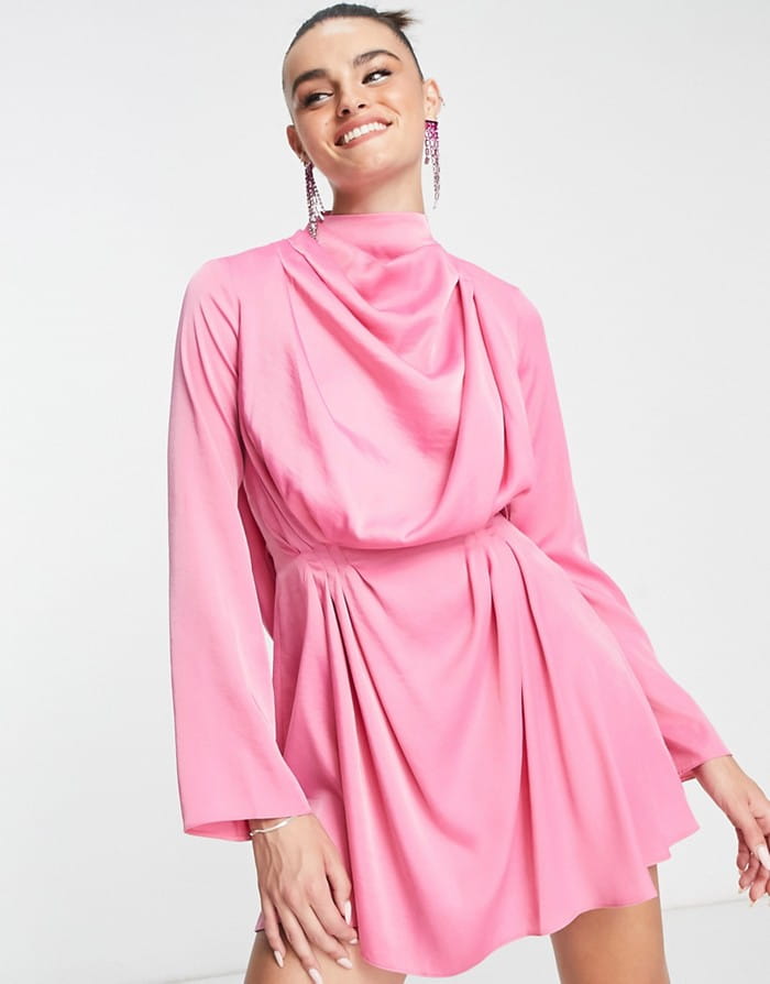 Ta urocza różowa sukienka o długości mini jest idealna na wieczorne wyjścia. Posiada stójkowy dekolt i długie rękawy, co dodaje elegancji. Doskonale podkreśli Twoją figurę i sprawi, że poczujesz się wyjątkowo.