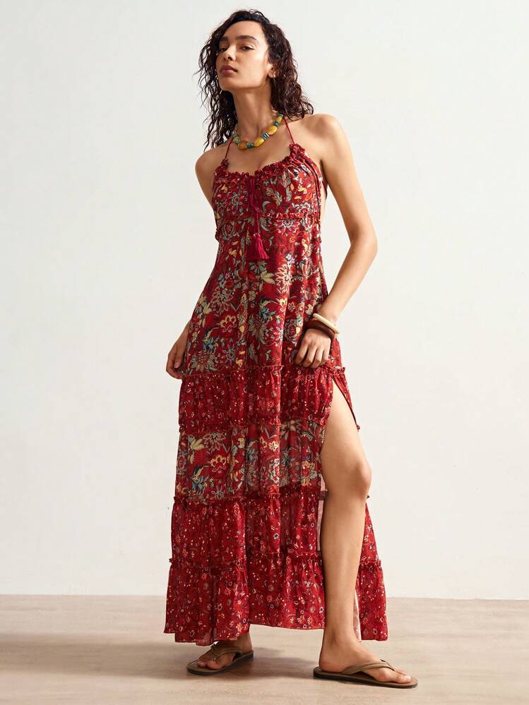 Elegancka i kobieca sukienka w odcieniu brązowym z delikatnym wzorem. Odkryte plecy i bezrękawnikowy fason dodają jej szyku. Idealna na specjalne okazje lub wieczorne wyjścia.