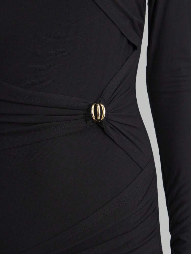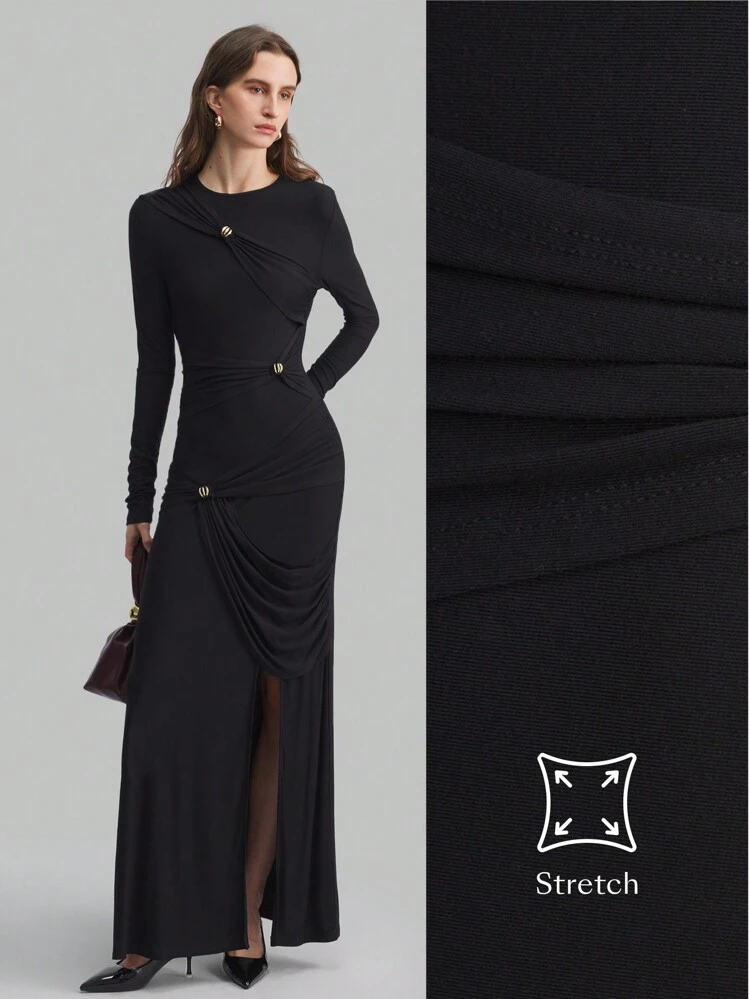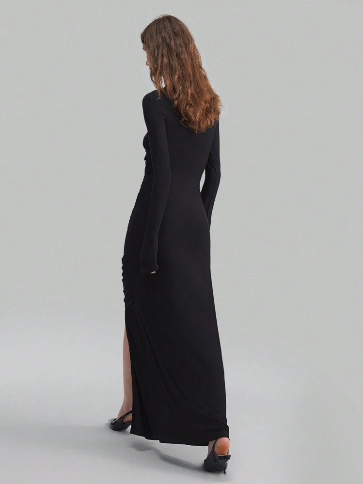 Elegancka czarna sukienka maxi z marszczeniami to idealna propozycja na wieczorne wyjścia. Posiada okrągły dekolt i długi rękaw, co dodaje jej szyku i klasy. Jest dopasowana, dzięki czemu podkreśla kobiecą sylwetkę.
