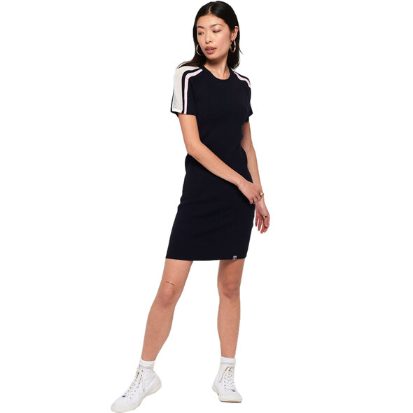 Elegancka granatowa sukienka mini z okrągłym dekoltem i krótkimi rękawami. Idealna na wieczorne wyjścia oraz inne okazje. Wykonana z wygodnej tkaniny, która pięknie podkreśla sylwetkę.