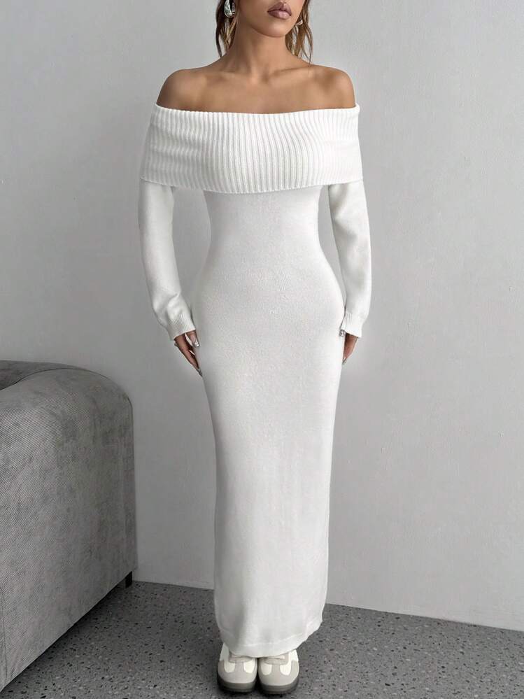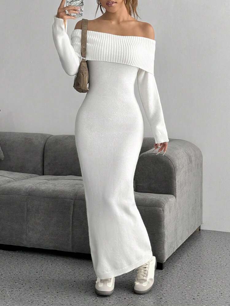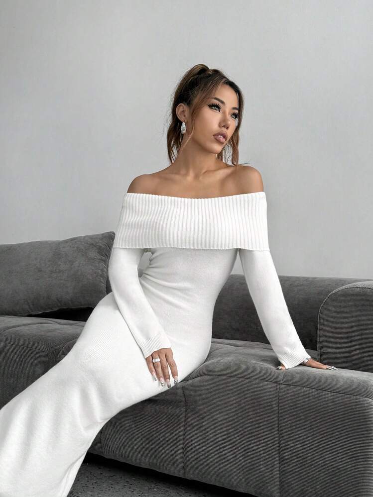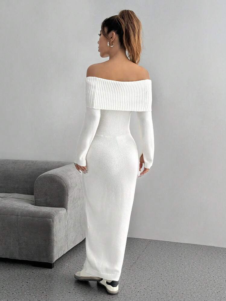 Luksusowa dzianinowa sukienka ecru maxi z odkrytymi ramionami/hiszpanką i długimi rękawami. Doskonała na wieczorne wyjścia i eleganckie okazje. Klasyczny kolor ecru pasuje do wielu stylizacji.