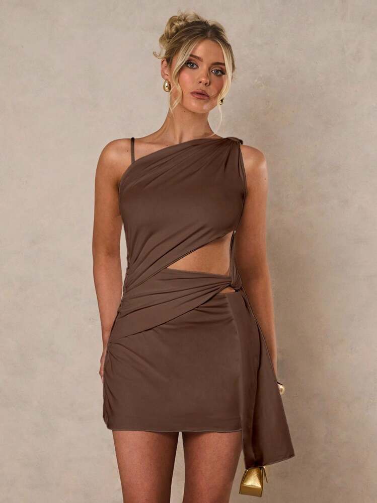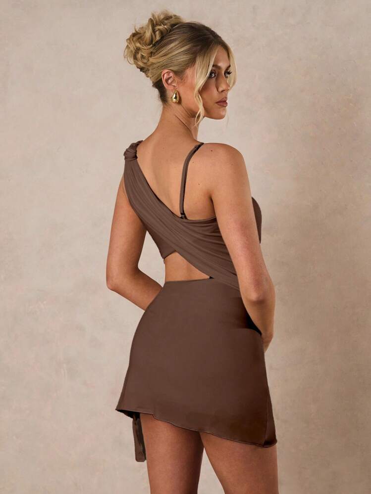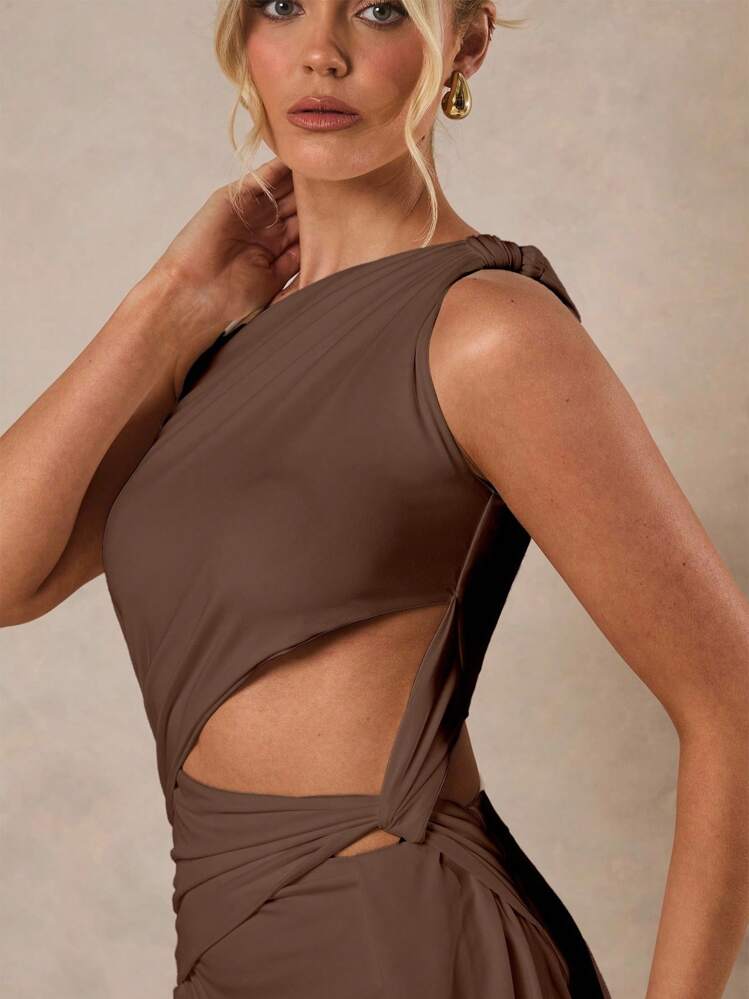 Elegancka sukienka w kolorze brązowym, o asymetrycznym dekolcie i bez rękawów. Modny detal w postaci cut outów na biuście nadaje jej wyjątkowego charakteru. Idealna na wieczorne wyjścia oraz specjalne okazje.