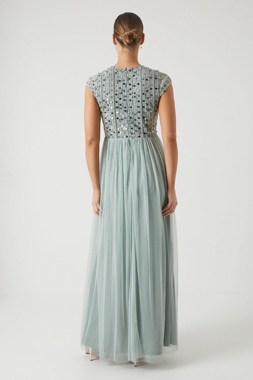 Sukienka maxi w kolorze zielonym, wykonana z delikatnego tiulu. Posiada zamek i okrągły dekolt. Krótkie rękawy dodają jej lekkości i elegancji. Idealna na różnego rodzaju uroczystości i wieczorne wyjścia.