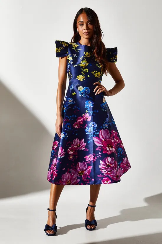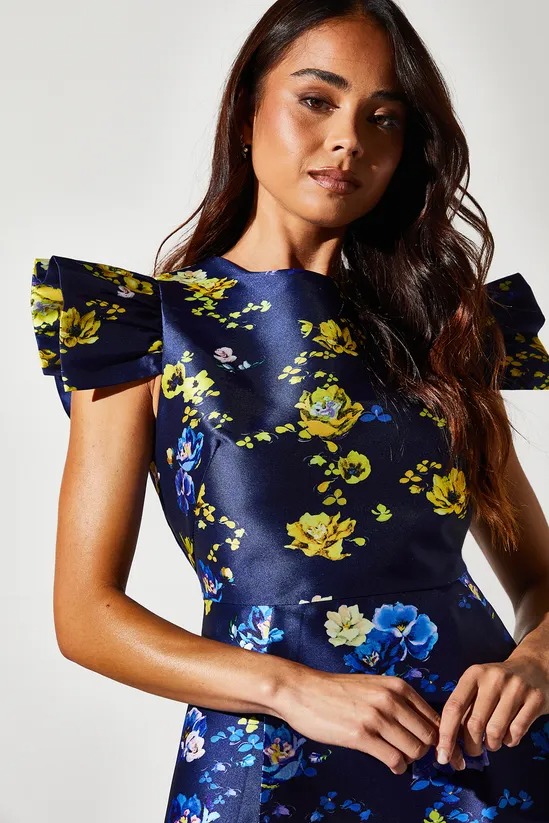 Granatowa sukienka z subtelnym wzorem kwiatów to idealna propozycja na lato. Dekolt okrągły i krótki rękaw dodają jej lekkości i świeżości. Świetnie sprawdzi się na wieczorne spotkanie czy wyjątkowe okazje.