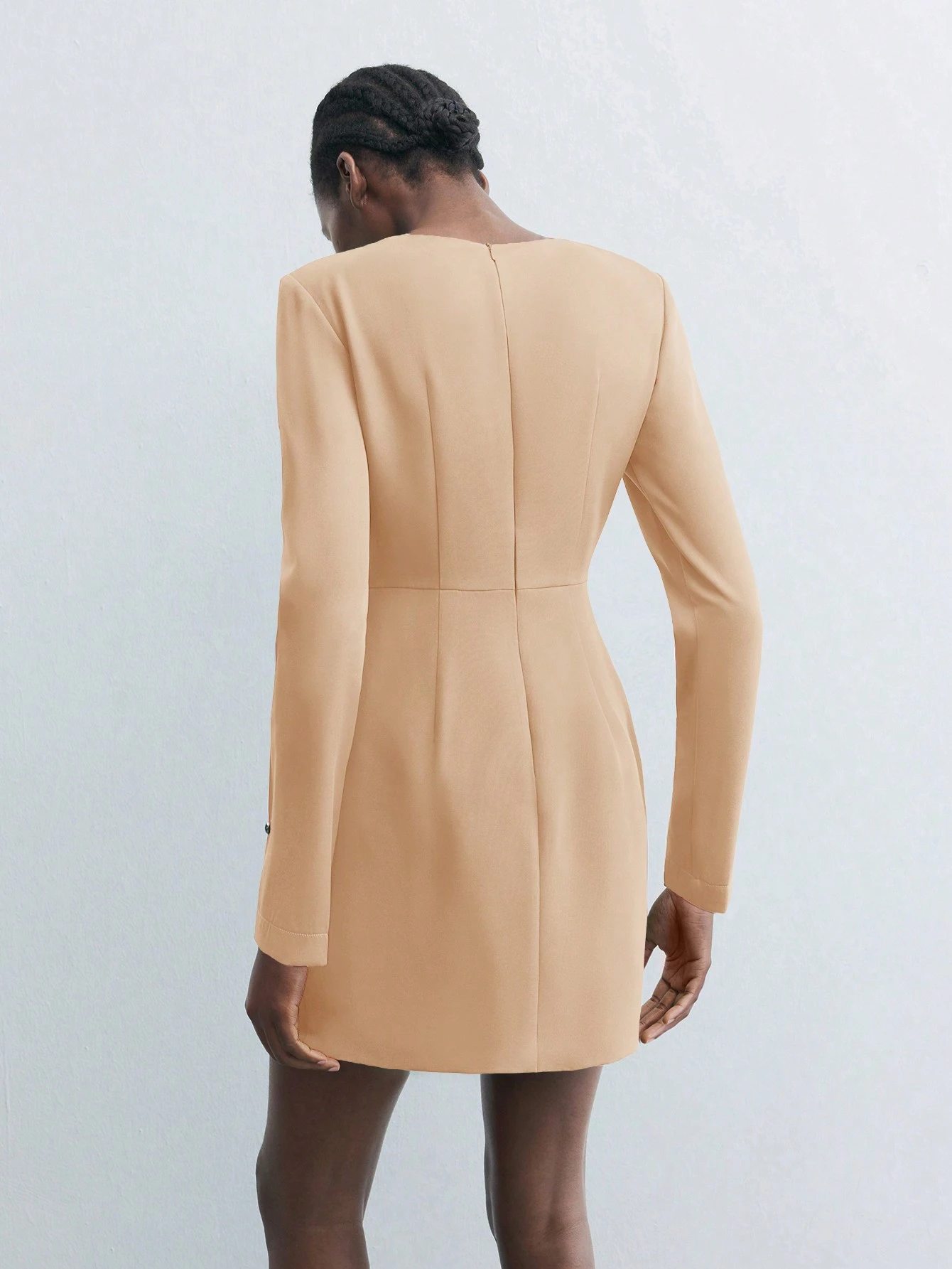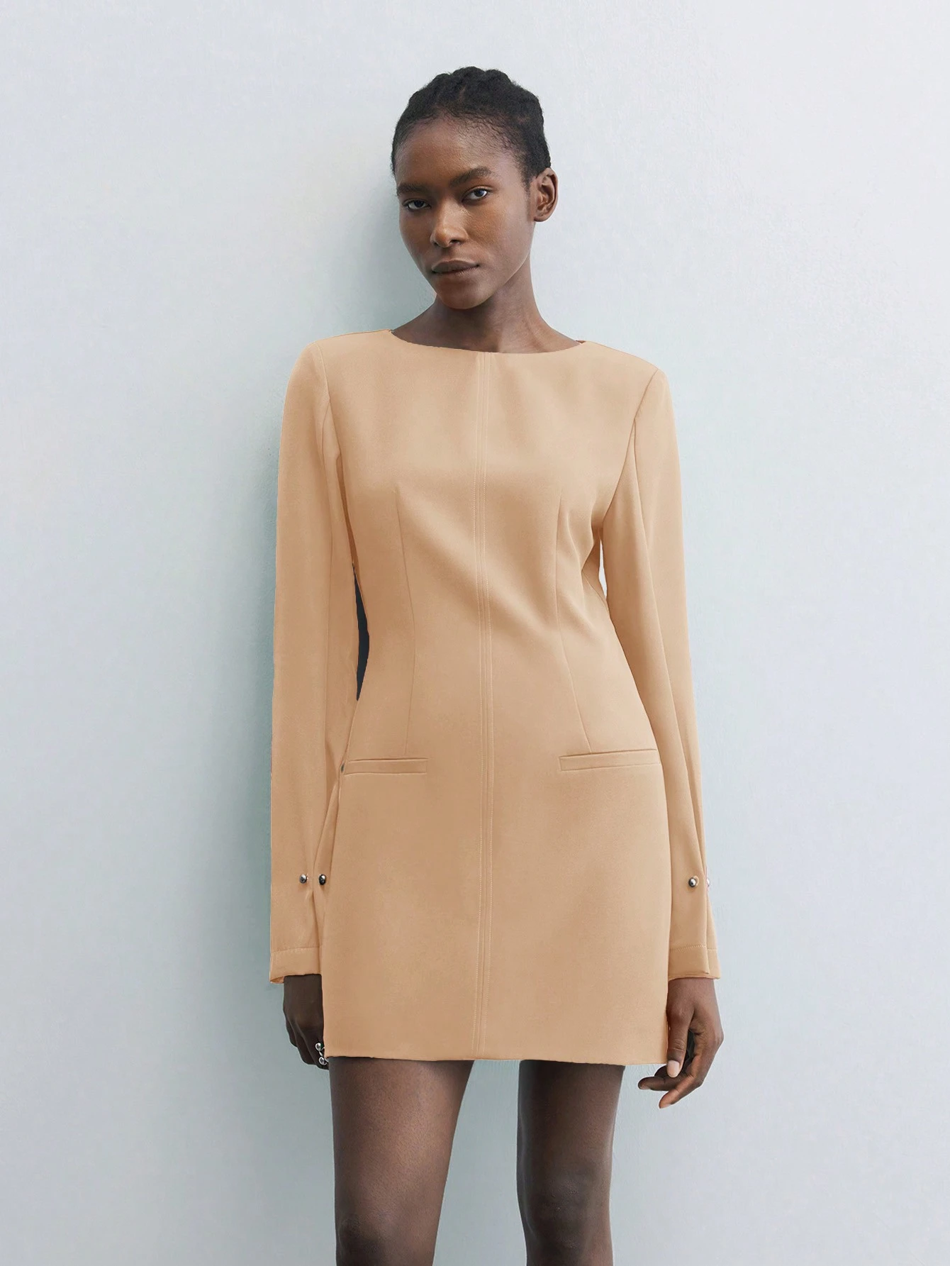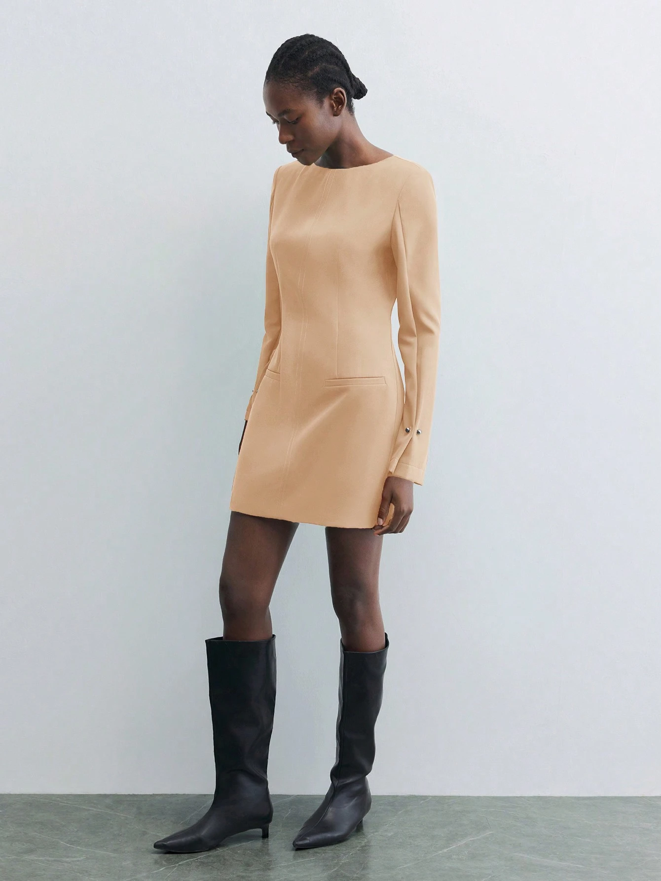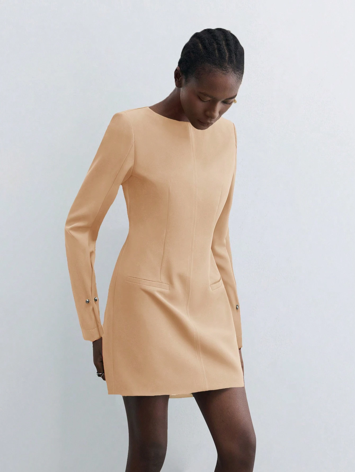 Elegancka beżowa sukienka mini z długim rękawem, idealna na wieczorne wyjścia. Posiada okrągły dekolt, który świetnie podkreśla szyję. Klasyczny kolor beżowy nadaje sukience ponadczasowej i uniwersalnej elegancji.