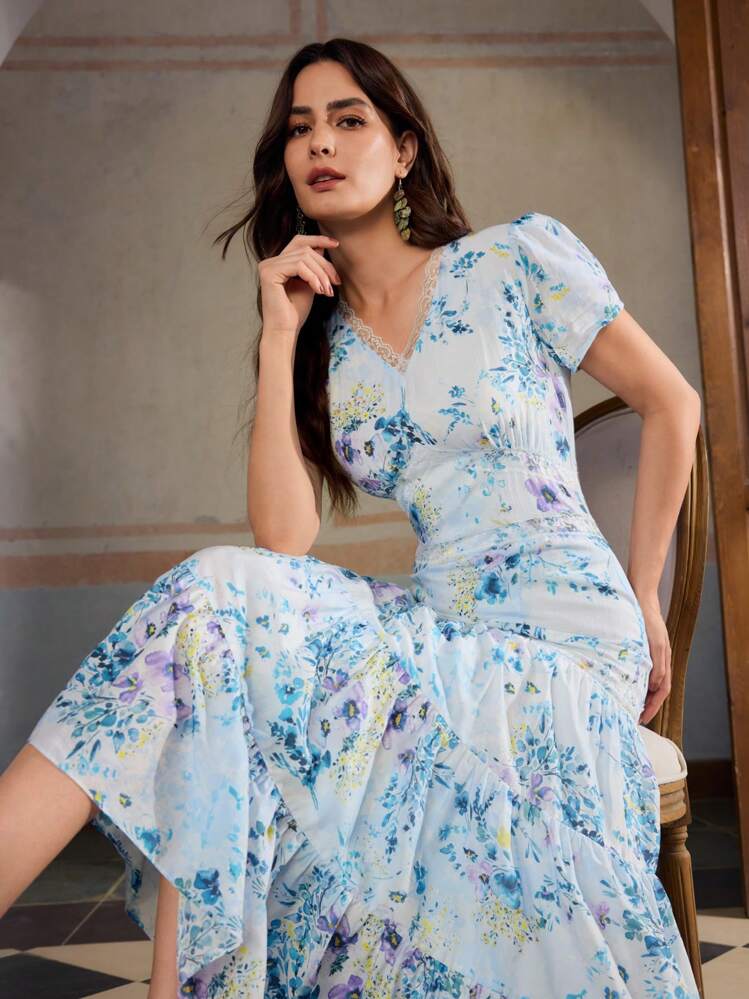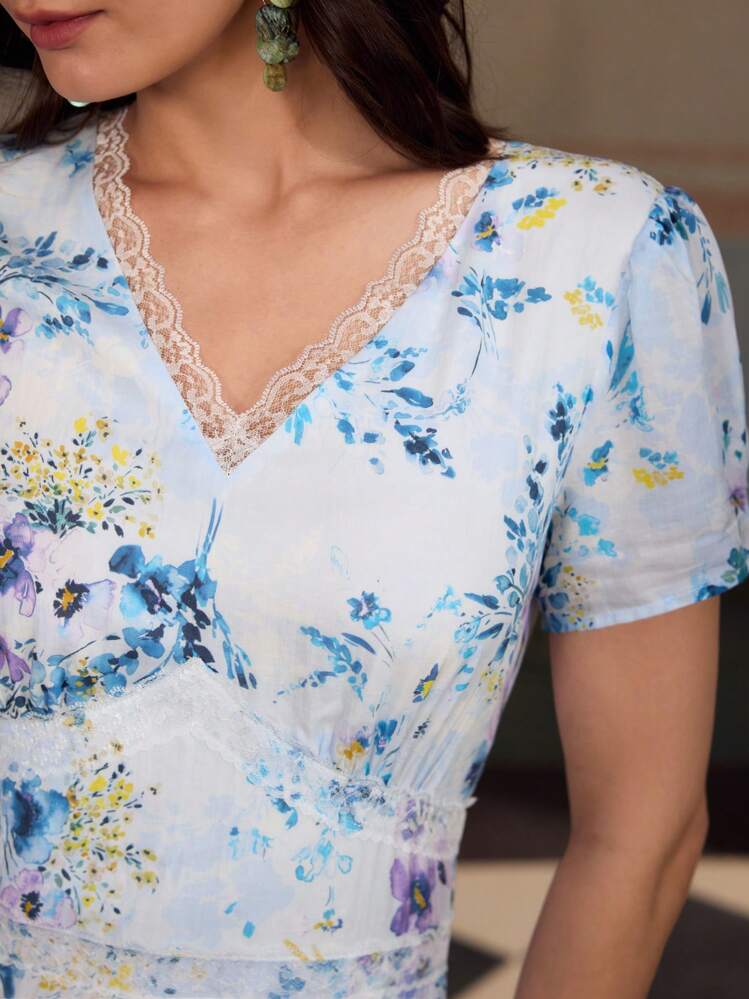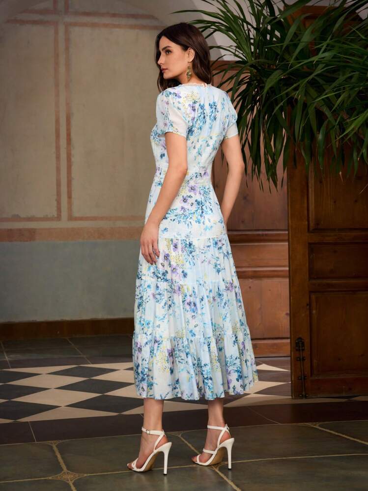 Ta błękitna sukienka midi w pięknym wzorze to must-have każdej kobiety. Dekolt typu serek lub V oraz krótki rękaw dodają jej subtelności i elegancji. Idealna na wieczorne wyjścia.