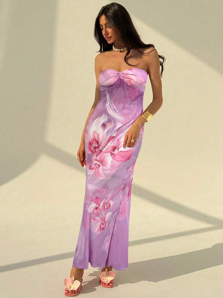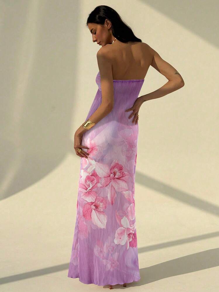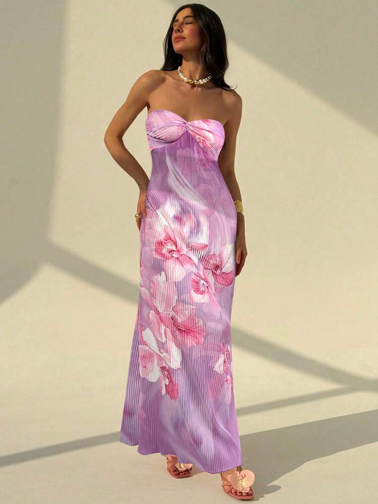 Efektowna sukienka maxi w kolorze fioletowym z plisowanym, lejącym materiałem. Dekolt w kształcie serca i bez rękawów dodają jej romantycznego, letniego charakteru. Idealna na wieczorne wyjścia lub uroczyste okazje.