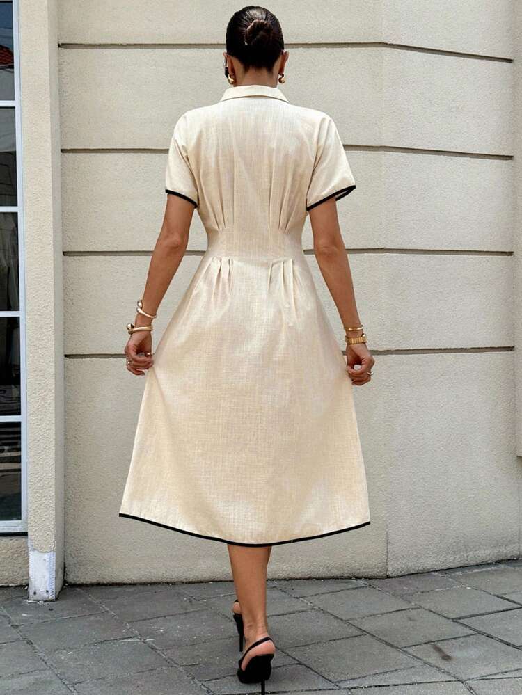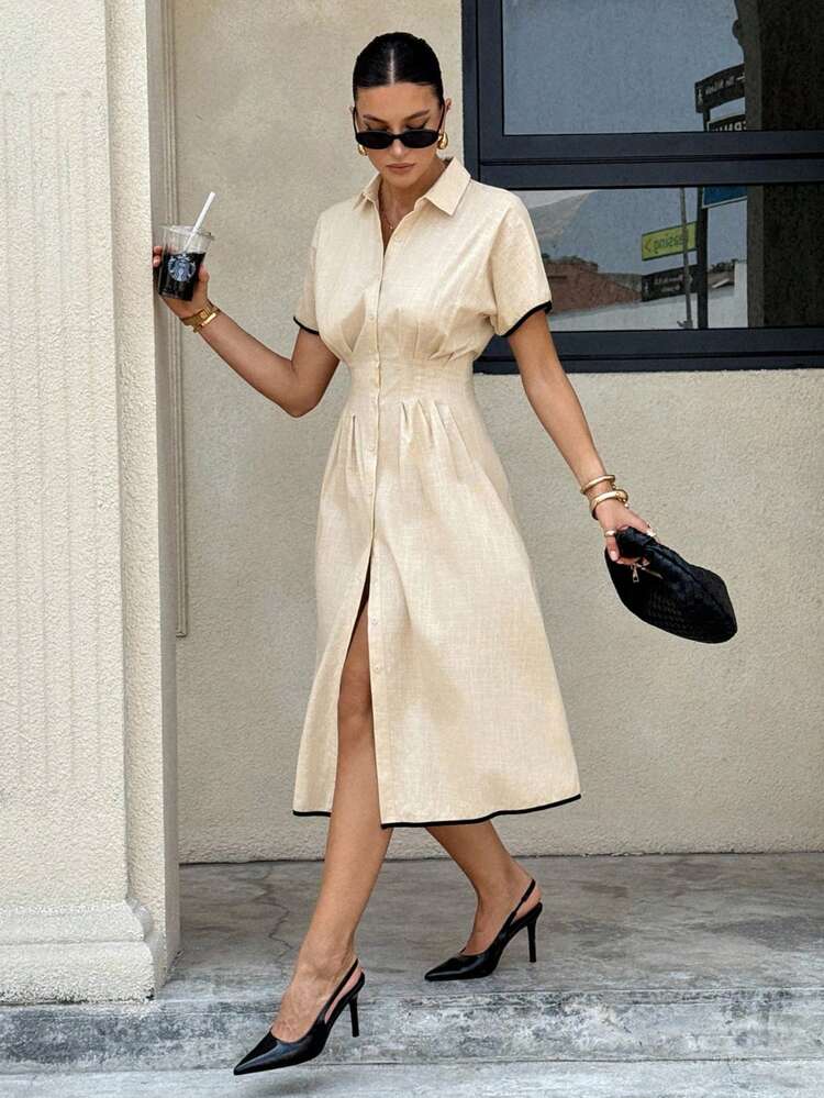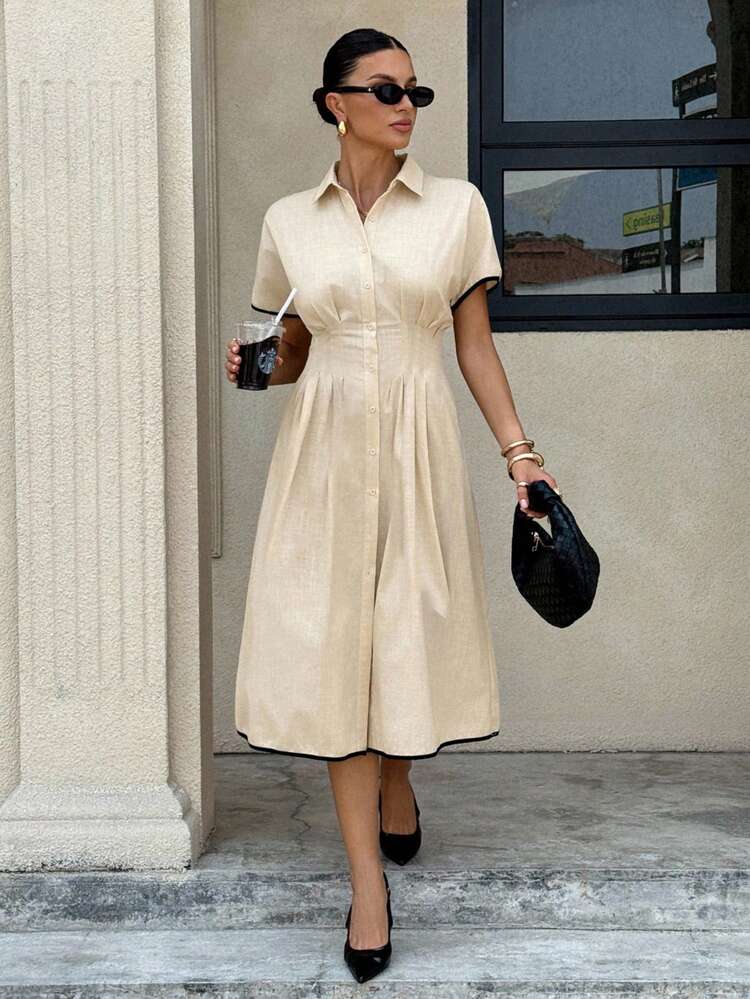 Ta beżowa koszulowa sukienka jest idealna na letnie dni. Wykonana z przyjemnego materiału, posiada krótki rękaw, kołnierzyk i jest dostępna w kolorze beżowym. Doskonale komponuje się z różnymi stylizacjami.