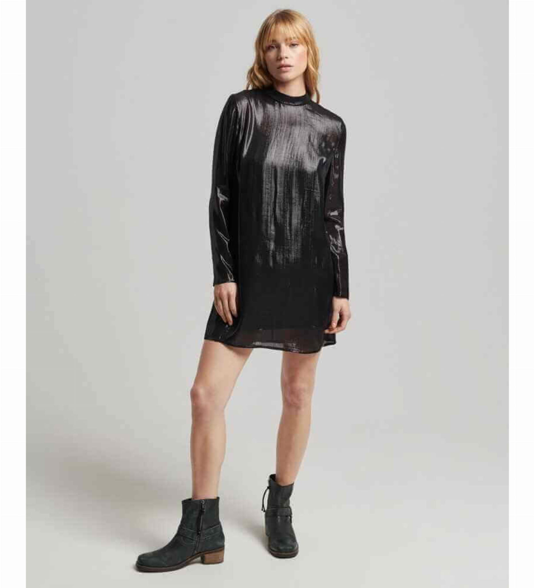 Elegancka i stylowa mini sukienka w kolorze czarnym, wykonana z błyszczącego materiału. Posiada stójkowy dekolt oraz długie rękawy, które dodają jej wyrafinowanego charakteru. Idealna na wieczorowe wyjścia i specjalne okazje.