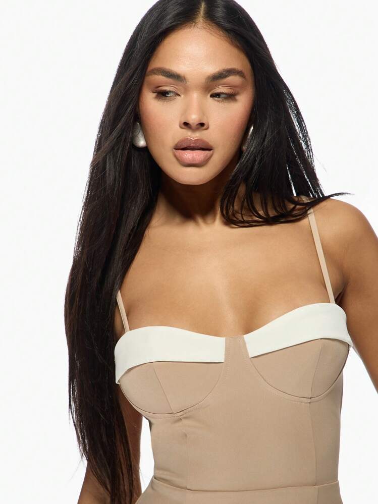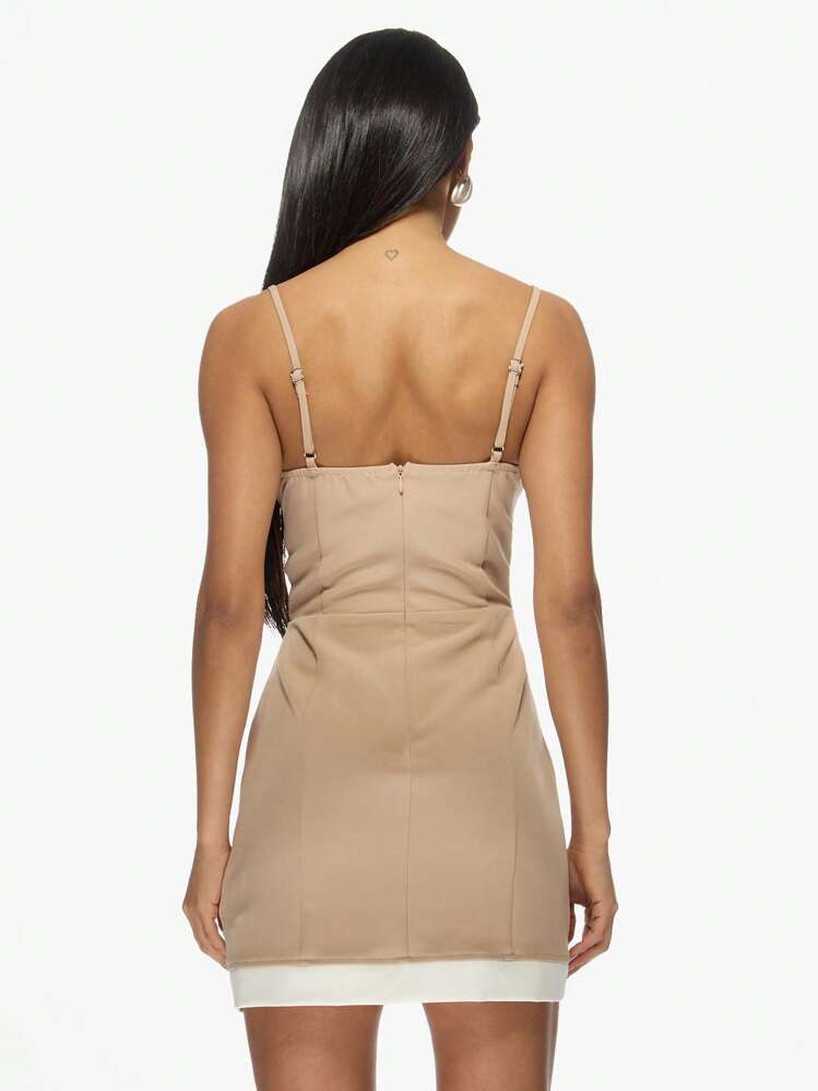 Elegancka i stylowa mini sukienka w kolorze beżowym. Posiada ramiączka oraz dekolt w kształcie serca, co dodaje jej uroku i kobiecości. Idealna na wieczorne wyjścia lub specjalne okazje. Wykonana z delikatnego i przyjemnego w dotyku materiału.