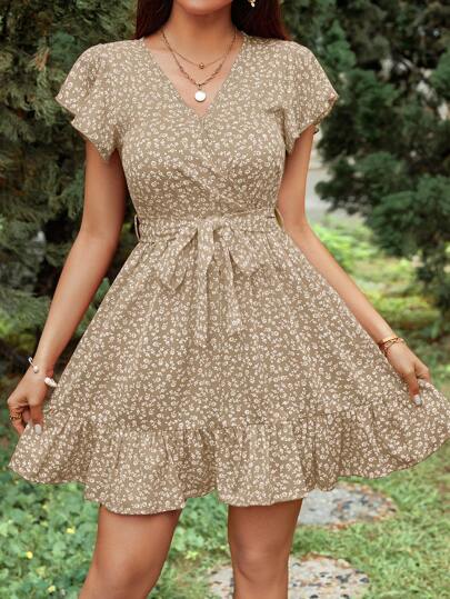 Seksowna brązowa sukienka mini z wzorem paska. Wykonana z lekkiego i przewiewnego materiału, idealna na letnie dni. Kopertowy dekolt i krótkie rękawy dodają uroku i kobiecości.
