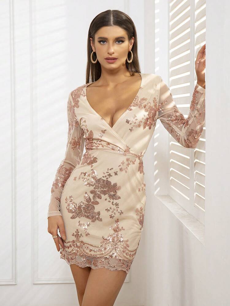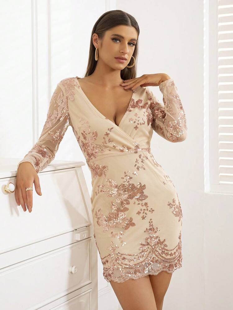 Ta elegancka sukienka w kolorze beżowym z cekinami z pewnością przyciągnie uwagę. Ma kopertowy dekolt i długi rękaw, dzięki czemu idealnie pasuje na różnego rodzaju okazje. Pięknie podkreśli sylwetkę i doda blasku każdej stylizacji.