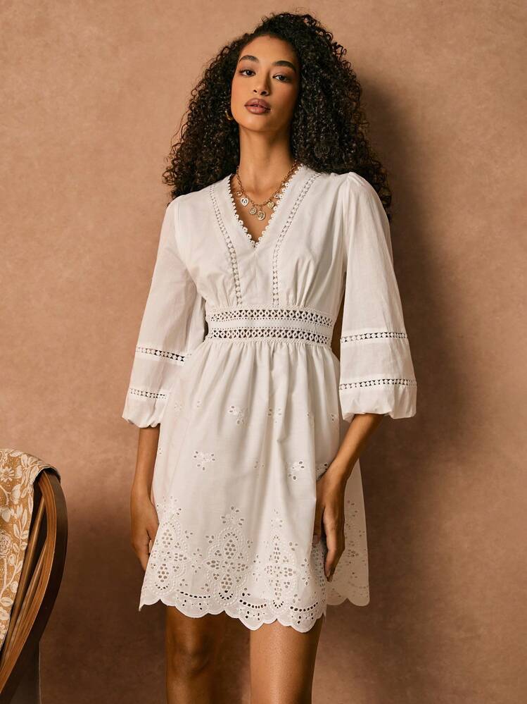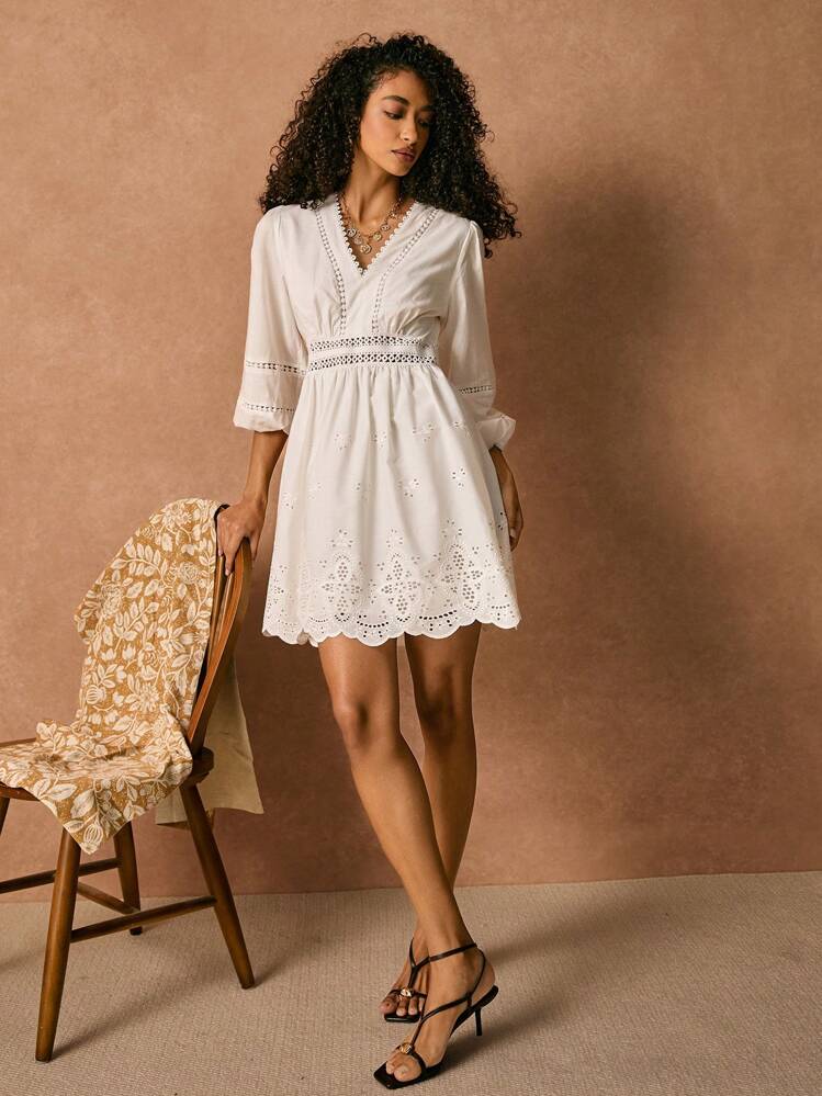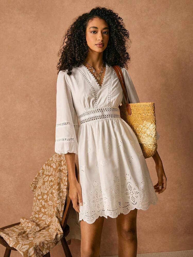 Ta stylowa sukienka mini w kolorze białym to idealna propozycja na nadchodzący sezon. Haftowane detale dodają jej uroku, a serek/dekolt V oraz rękaw 3/4 podkreślają kobiecy wygląd.