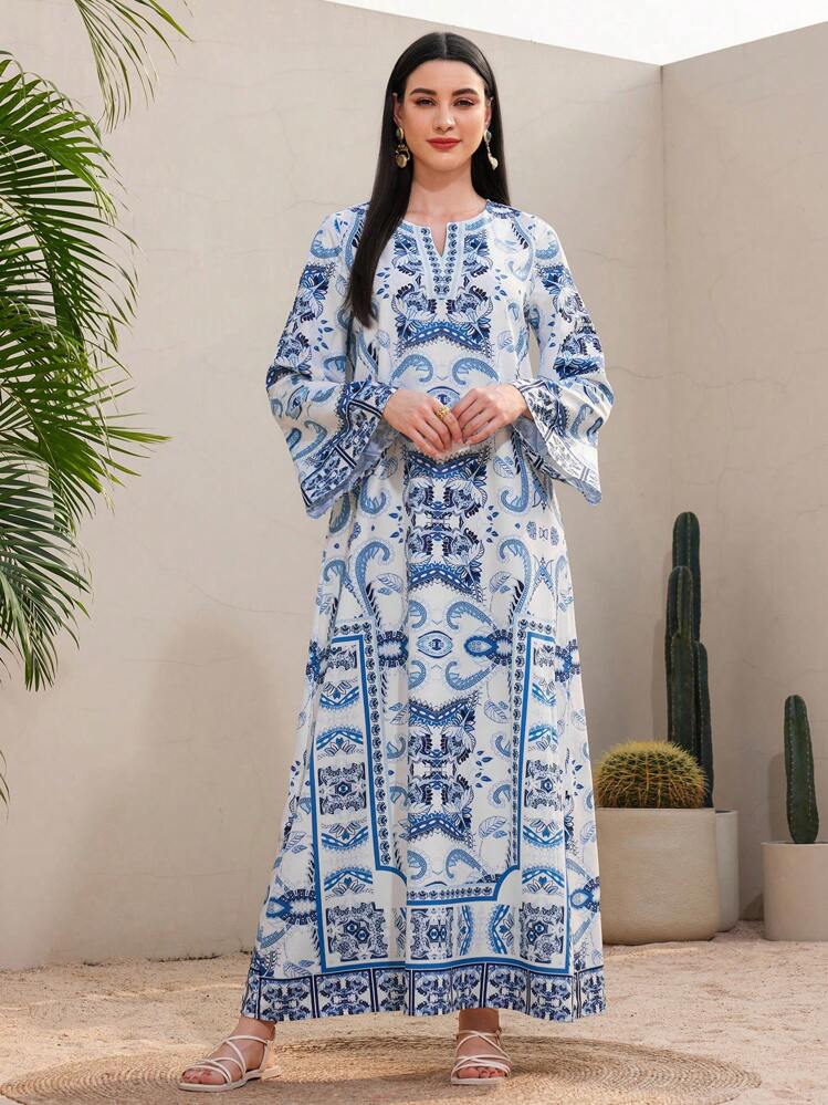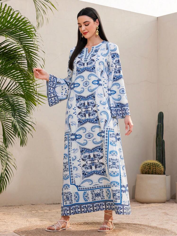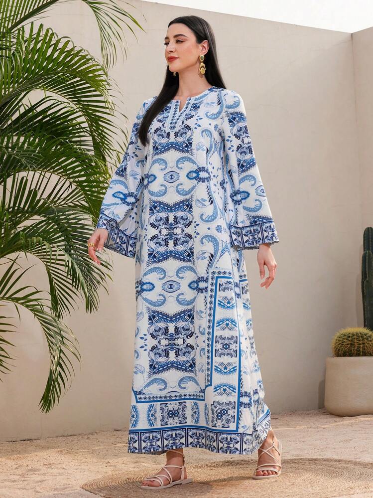 "Biała sukienka z szerokimi rękawami i dekoltem w serek. Wzór dodaje jej charakteru, a długi rękaw zapewnia wygodę i elegancję. Idealna na wieczorowe wyjścia lub na letnie dni."