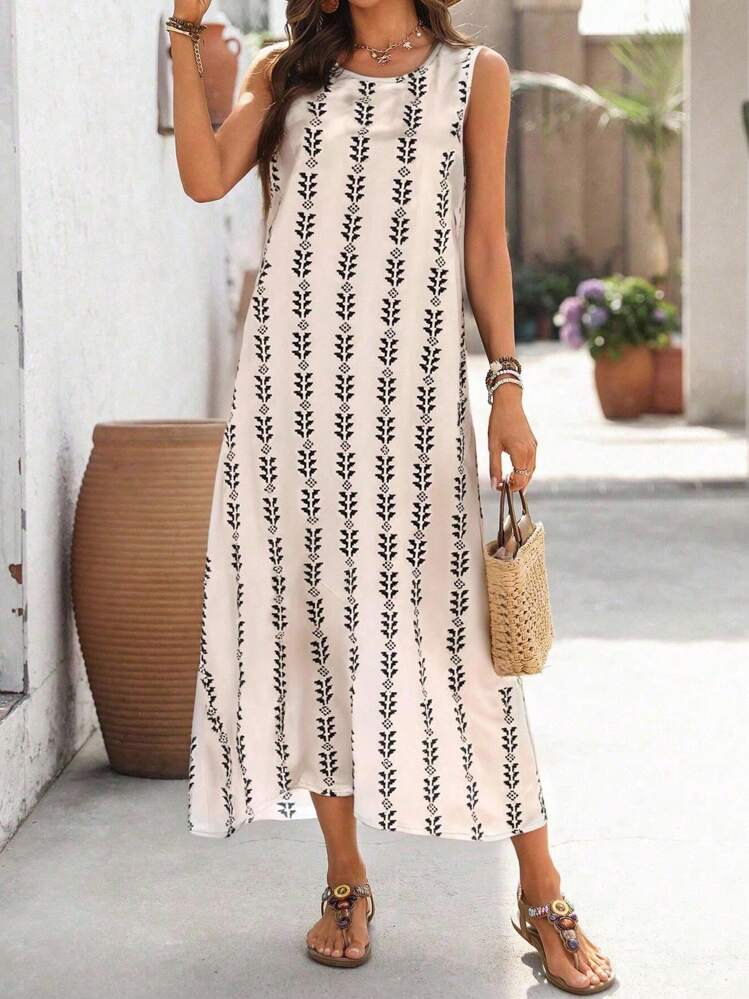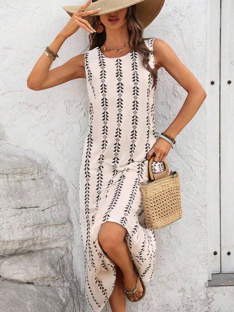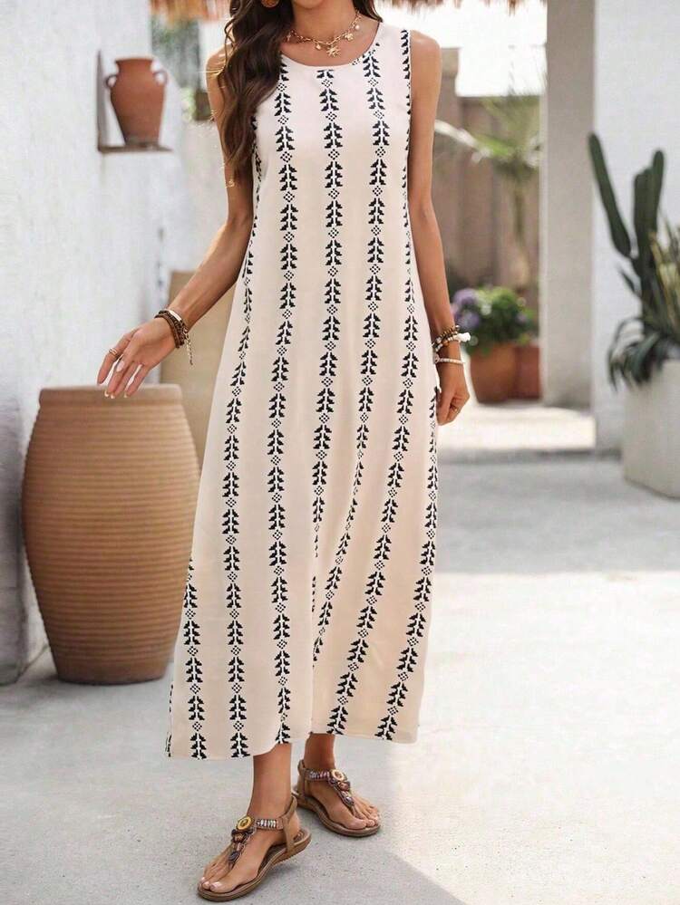 Beżowa prosta sukienka wzór (XL)