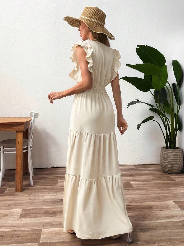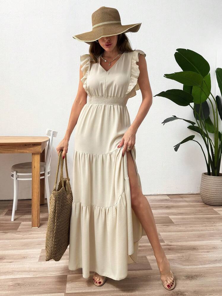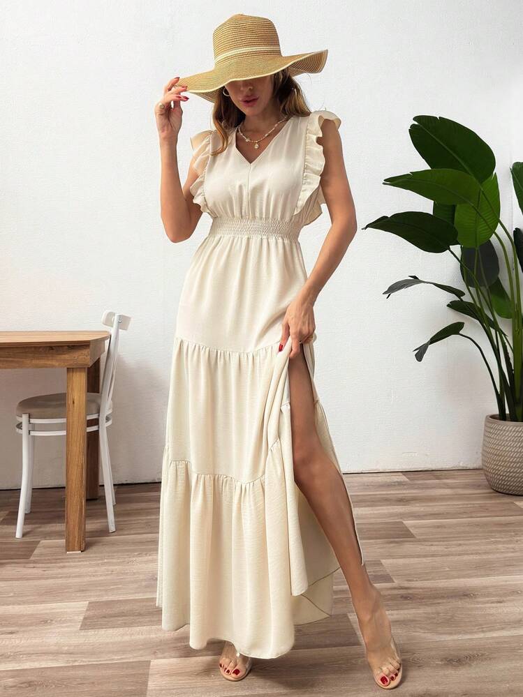 Elegancka sukienka maxi w kolorze beżowym z rozcięciem na nogę. Posiada dekolt V oraz krótkie rękawy. Idealna na lato i specjalne okazje. Wykonana z wygodnego materiału.