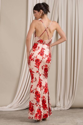 Beżowa satynowa sukienka wzór kwiaty (36) Beżowa satynowa sukienka wzór kwiaty (36)