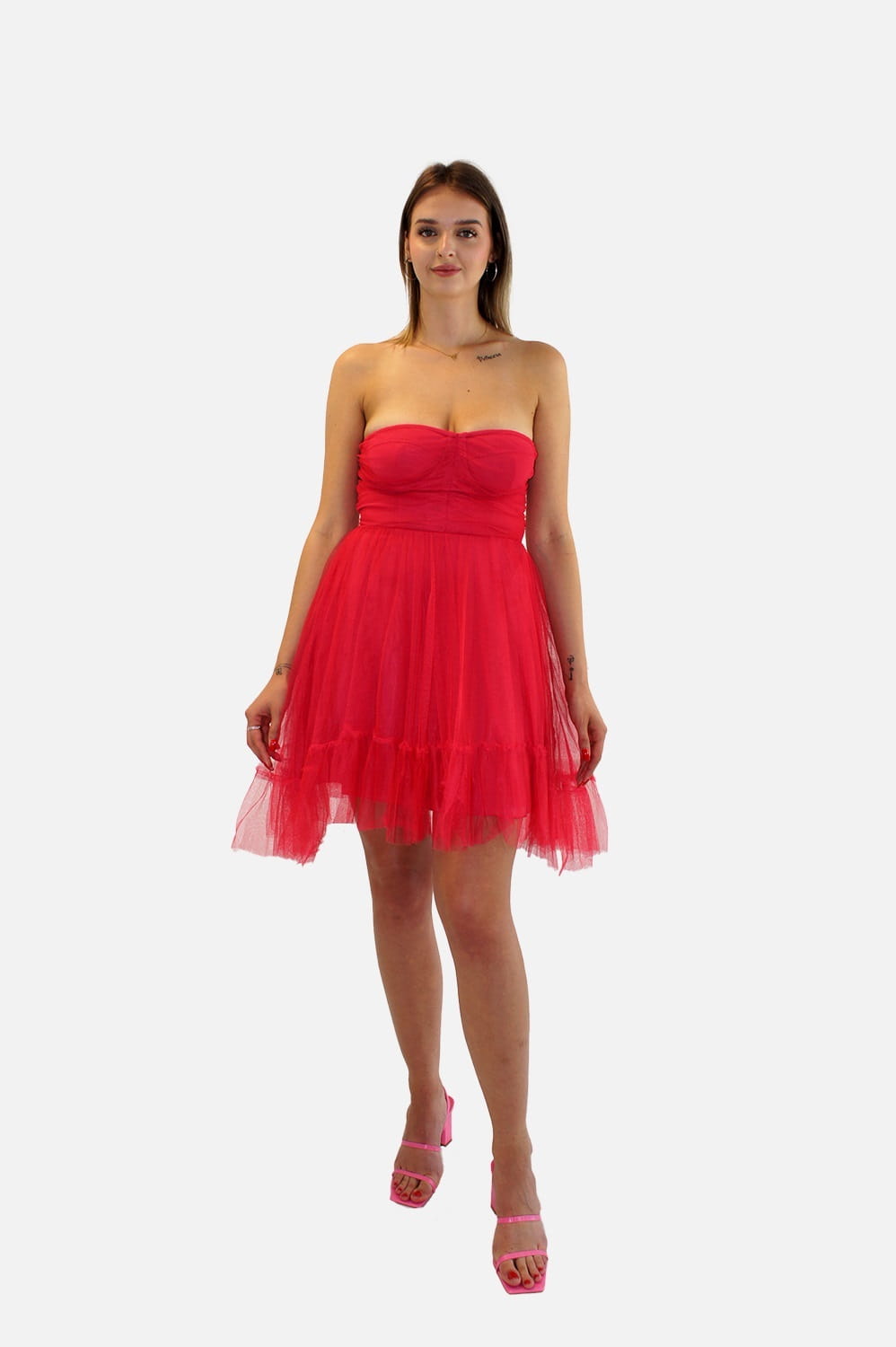 Różowa tiulowa sukienka off shoulder (M)